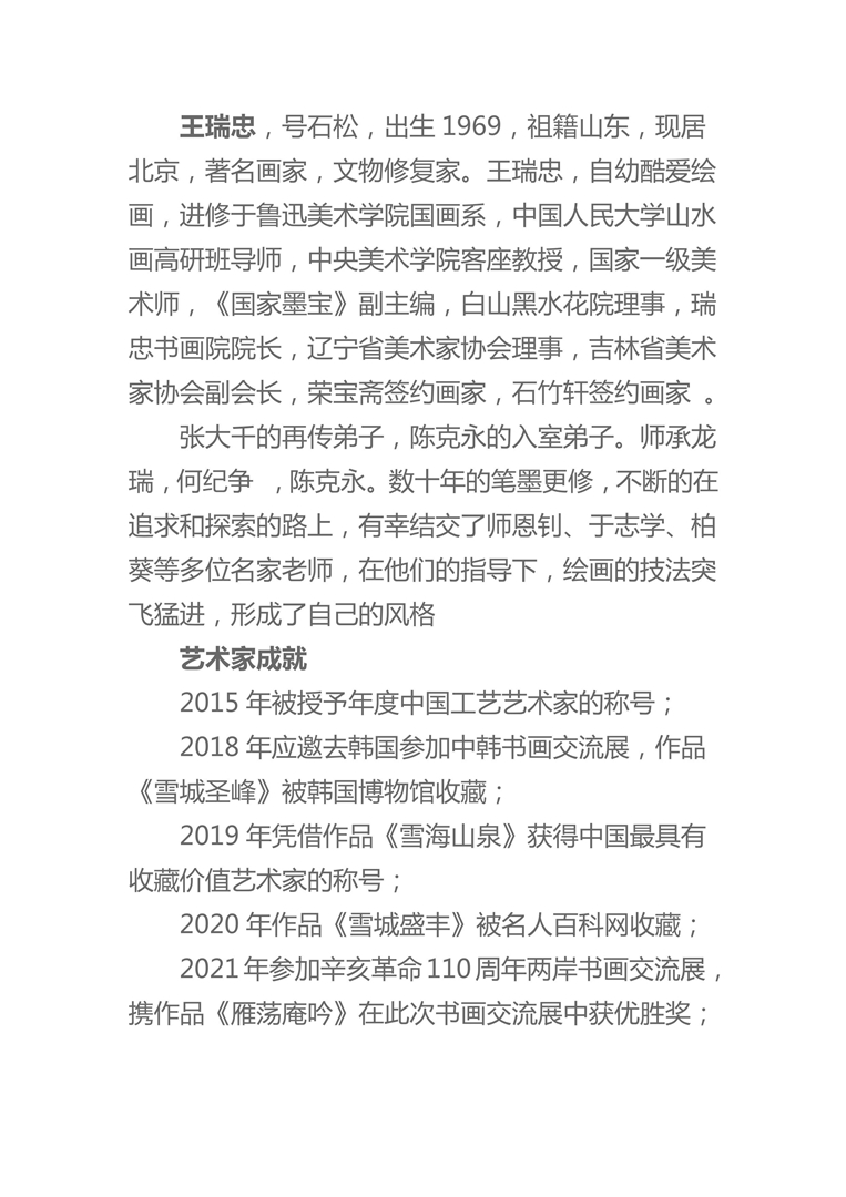 王瑞忠,号石松,出生1969,祖籍山东,现居北京,著名画家,文物修复家。王瑞忠,自幼酷爱绘画,进修于鲁迅美术学院国画系,中国人民大学山水画高研班导师,中央美术学院客座教授,国家一级美术师,《国家墨宝》副主编,白山黑水花院理事,瑞忠书画院院长,辽宁省美术家协会理事,吉林省美术家协会副会长,荣宝斋签约画家,石竹轩签约画家 。